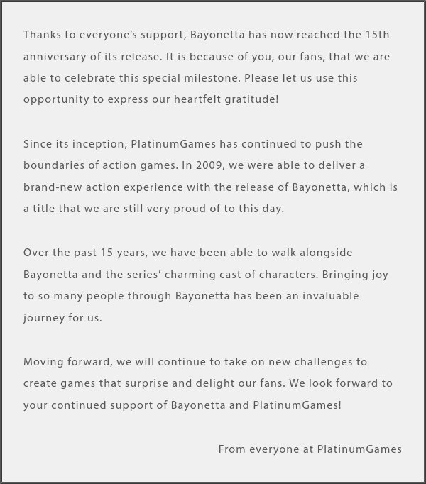 Kein Wunder also, dass die Fans im Zuge des 15jährigen Jubiläums darauf hoffen, dass insbesondere Teil 2 auch für andere Plattformen ausserhalb des Nintendo-Ökosystems veröffentlicht werden kann. Das allerdings dürfte schwer davon abhängig sein, ob Nintendo als Geldgeber und Publisher diesem Vorhaben seine Zustimmung erteilt. Ohne zu viele Details zu verraten, melden sich natürlich auch die Entwickler selbst mit einer Nachricht an die Fans und bedanken sich bei diesen für die jahrelange Unterstützung – und versprechen, ein spezielles „Bayonetta 15th Anniversary“-Jahr zu feiern.